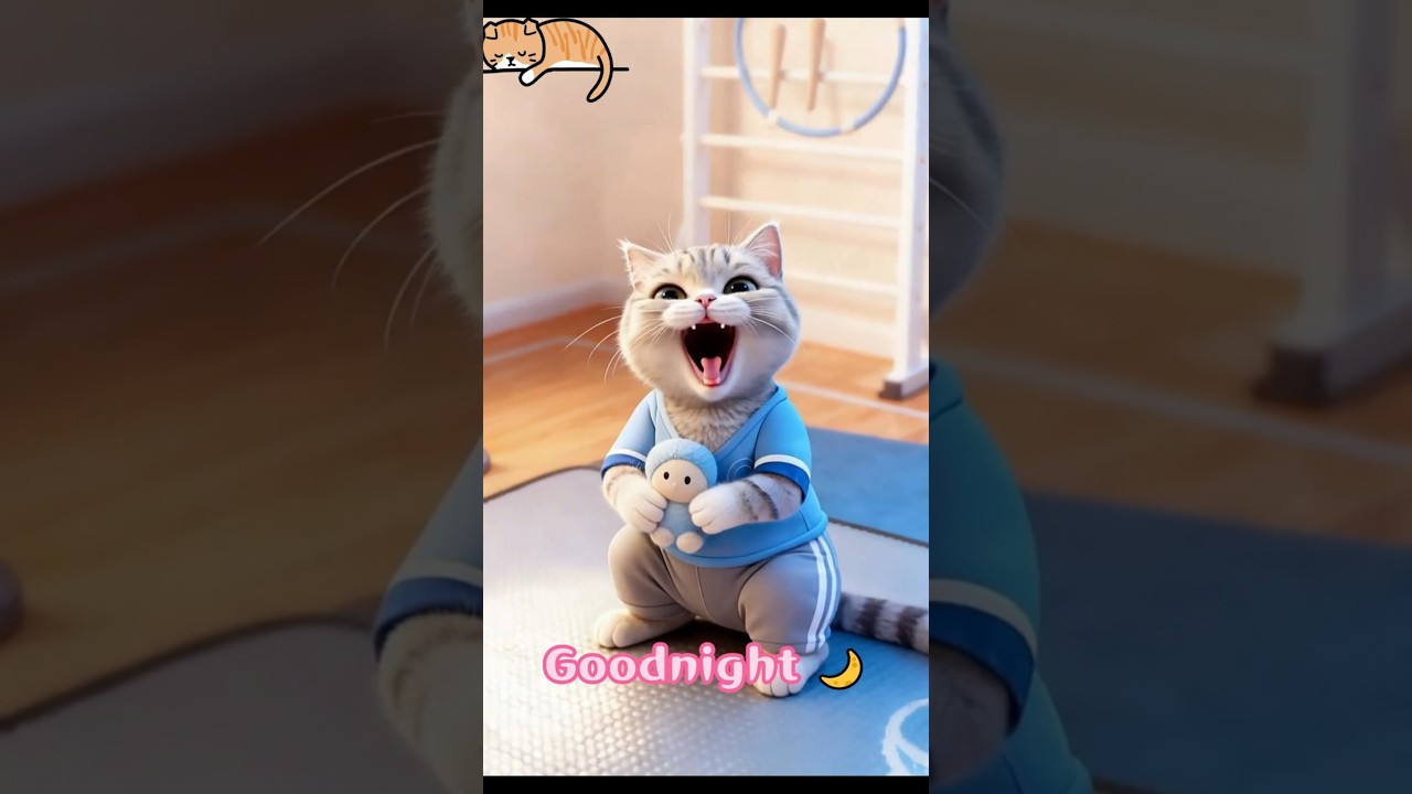 Step into a peaceful gymnastics gym with Mimi, where soft mats and warm lighting set a calming tone. In her light-blue gymnastics-themed pajamas, she curls up on a mat hugging a tiny plush gymnastic ball and drifts into a long, relaxed yawn. She then stretches out near the edge of the mat, snuggling the ball close as she releases another sleepy sigh. Finally, seated right in the center of the mat, she offers one last big yawn before gently raising her paw to wave you goodnight.