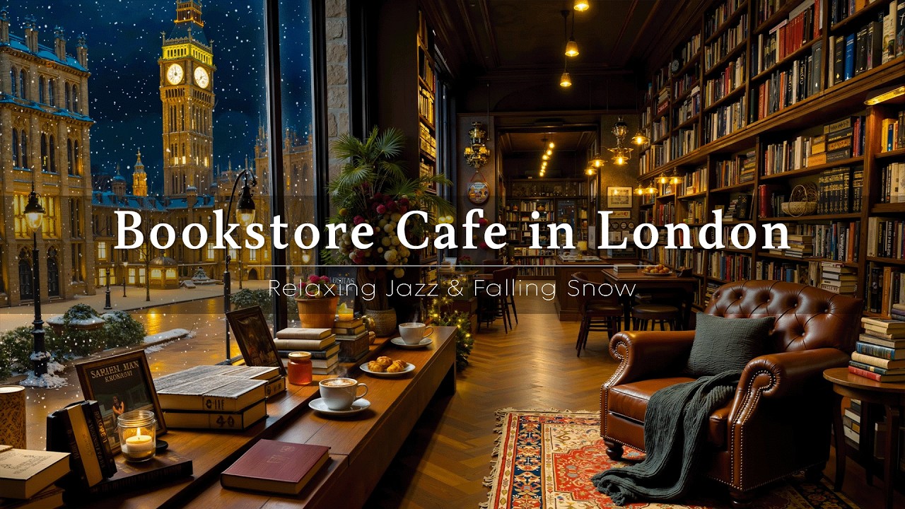 Imagine sitting at a small café table surrounded by books, a warm cup of coffee in hand, while smooth piano jazz plays softly in the background. Outside, snowflakes fall slowly over the streets of London, adding a serene, cinematic calm to the scene. Inside, the atmosphere remains warm, quiet, and inviting.