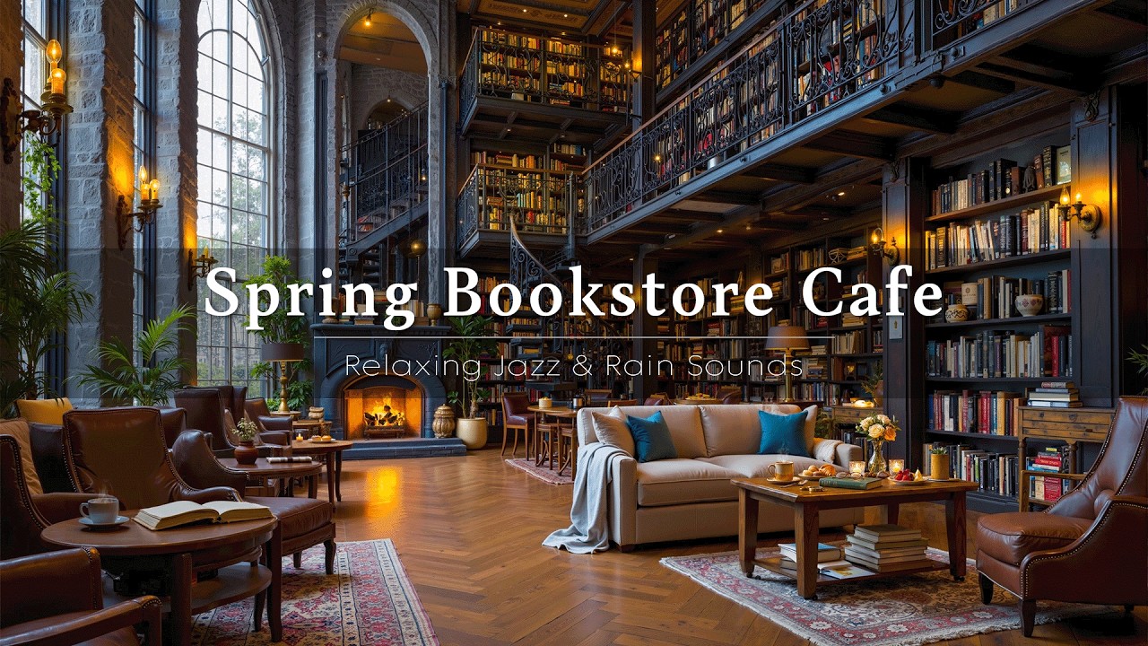 Step into a peaceful bookstore café on a rainy spring afternoon. Outside, gentle rain taps softly against the windows while inside, the warm glow of a fireplace flickers beside shelves filled with books. Smooth jazz music flows gently through the space, creating a calm and comforting atmosphere perfect for reading and relaxation.