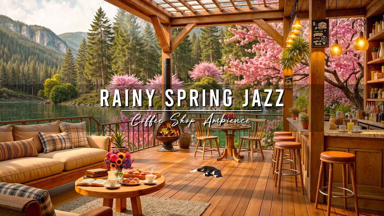 📌 This image captures a peaceful Spring moment at a charming wooden lakeside coffee shop while a gentle Rain falls outside. Soft raindrops ripple across the calm lake as pink cherry blossoms bloom beautifully around a small waterfall and lush forest. The distant mountains and vibrant greenery reflect the freshness of Spring, while the quiet rhythm of the Rain creates a soothing atmosphere that perfectly matches smooth Jazz Piano melodies. Inside the cozy coffee shop, warm wooden textures and soft golden lights create a welcoming retreat from the Rainy Spring weather. A glowing fireplace adds comfort beside a relaxed sofa, while a small round table holds coffee, pastries, and colorful flowers. The cafe bar with wooden stools and shelves of jars completes the rustic charm, while a peaceful cat naps on the floor, adding to the calm and intimate mood.